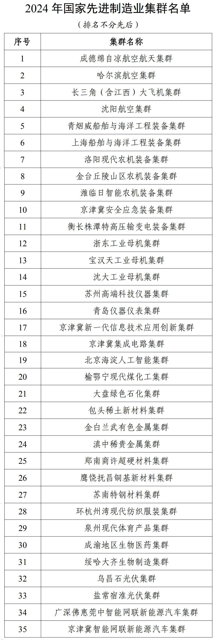 为贯彻落实党中央、国务院决策部署,培育壮大先进制造业集群,工业和信息化部组织开展2024年先进制造业集群竞赛。经小组赛、综合赛评审并向社会公示,现公布成德绵自凉航空航天集群等35个集群为国家先进制造业集群(以下简称国家级集群),有关事项通知如下。