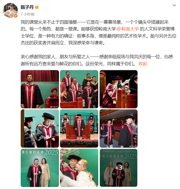 1月27日,甄子丹在微博发文回应:“我的课堂从来不止于四面墙壁——它是在一幕幕场景、一个个镜头中搭建起来的。每一个角色,都是一堂课。能够获授岭南大学的人文科学荣誉博士学位,是一种有力的确证:叙事本身,便是最纯粹的艺术性学术。能与另外五位杰出的获奖者并肩而立,我深感荣幸与谦卑。”