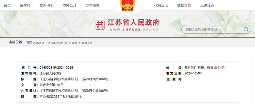 第三十七条 本办法自2025年3月1日起施行。2010年3月24日江苏省人民政府发布的《江苏省科学技术奖励办法》(江苏省人民政府令第61号)同时废止。