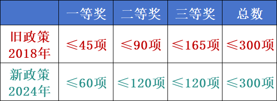 新版政策的一等奖授奖总数从不超过45项变更为不超过60项;二等奖授奖总数从不超过90项变更为不超过120项,三等奖数量从不超过165项变更为不超过120项。